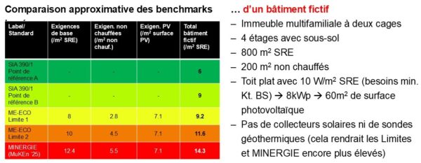 – Ambitieux (aligné sur les objectifs de neutralité carbone de la Confédération) - Minergie-ECO définit deux valeurs limites spécifiques au projet :