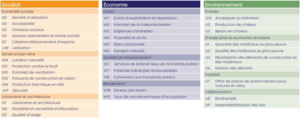 Certains thèmes, qui étaient jusqu’à présent traités dans des indicateurs spécifiques et étaient de ce fait relativement surévalués, ont été regroupés en un seul indicateur. Ainsi, la sécurité subjective et la sécurité liée au trafic, les polluants du bâtiment et le radon, ainsi que les possibilités de rencontre dans les espaces intérieurs et extérieurs ont chacun été regroupés en un seul indicateur.