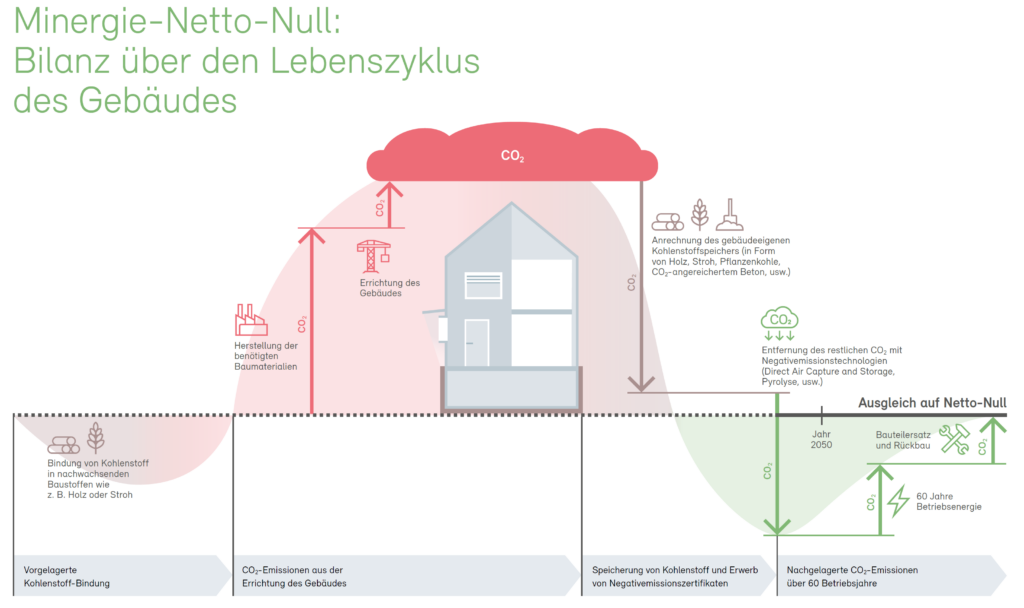 Beim Neubau basiert das Label auf einem Minergie-P/-A-ECO-Standard, für Sanierungen genügt der Minergie-Standard. Das Label kann zudem mit dem SNBS-Hochbau kombiniert werden. Das Produkt folgt einem dreiphasigen Vorgehen, das bereits in der Projektkonzeption beginnt: In der ersten Phase gilt es, CO2 zu vermeiden – Emissionen werden, wo immer möglich, reduziert. In der zweiten Phase steht das Speichern im Fokus – Kohlenstoff wird im Gebäude für 60 Jahre oder länger gebunden. Und in der dritten Phase erfolgt das Ausgleichen – die restlichen Emissionen werden durch geprüfte Negativemissionszertifikate ausgeglichen, mit Permanenzen über Jahrhunderte bis Jahrtausende. Nach dem Erwerb der entsprechenden Negativemissionszertifikate wird das Minergie-Netto-Null-Zertifikat ausgestellt. Das Gebäude verfügt dann für die nächsten 60 Betriebsjahre über eine CO2-neutrale Bilanz.